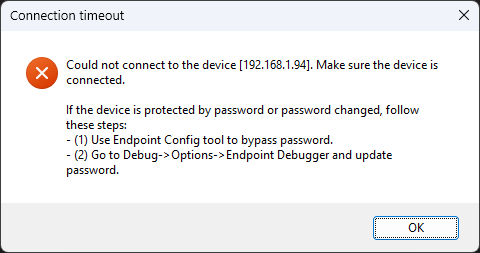I started from a file, a new project, and I’m not getting the debugger to connect to the device. Yes, the device is also exposed over Ethernet as x.1.94