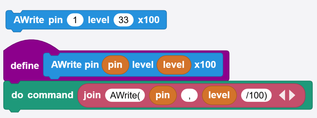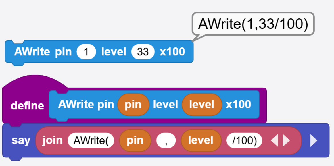 Similarly, a function might take a float number. For example, AWrite(pin, level)use a level between 0 and 1, where 0.33 is 33% for example. In this case, using a x100 multiplier will work well. AWrite(1, level/100) will work great if level is 33 because the engine will internally divide the value by 100 and the internal function will see 0.33.