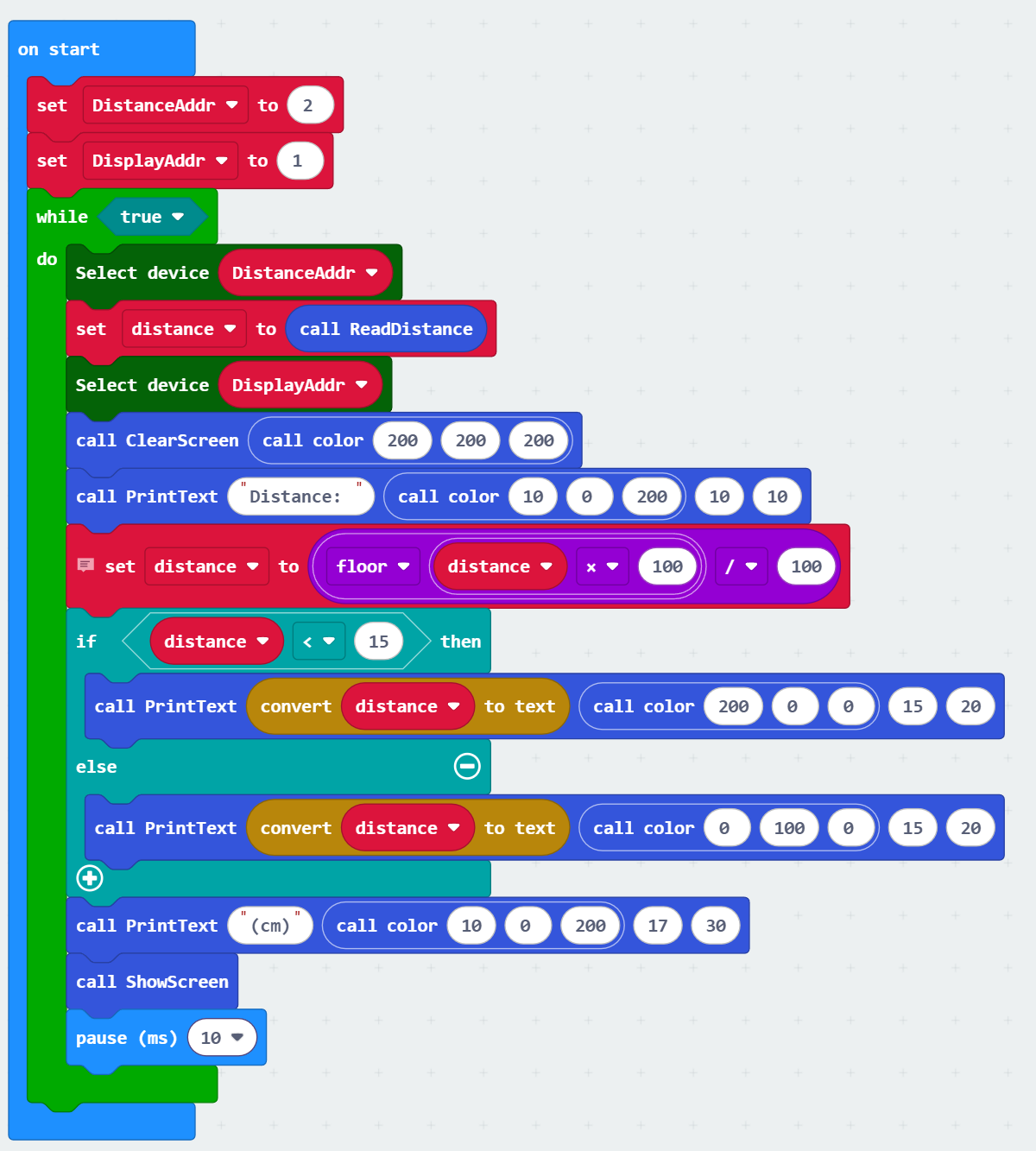 The main loop reads the distance and shows the numbers in different color if the distance is less than 15cm.