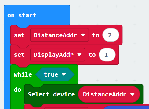 Lastly, we need to select which module the command is getting sent to. Modules addressing is easy in this demo because we only have 2 modules. The display being 1 and the distance sensor is 2. Instead of trying to memorize the module address, we will create 2 variables to help the address. Then we use those variables in our loop.