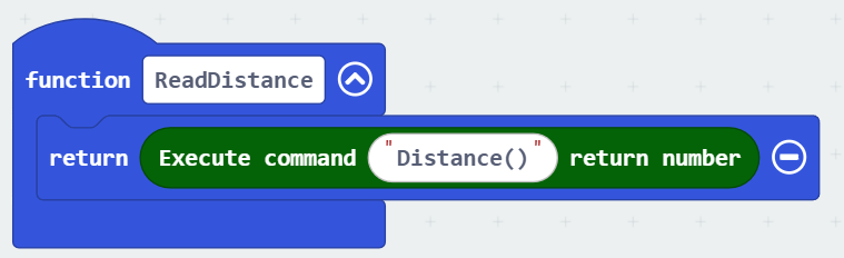 You can now send commands to draw on the display using text(“hello”,0xff0000,10,10) or read distance using distance(). Instead of typing the command in for every use, we will make a function instead. Here is the Execute command block in its simplest form.