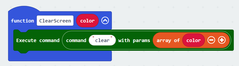 Other commands take arguments. We have a block builder to help with those. The arguments are passed in an array, even if it is a single argument. Here is a block that sends Clear(color) command.