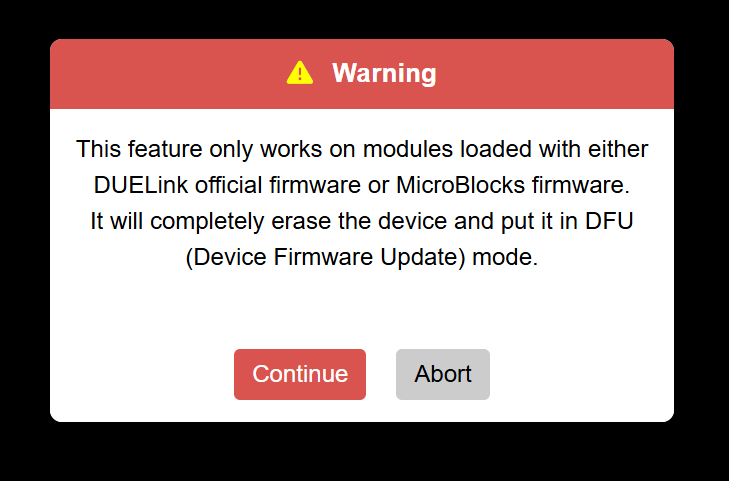 The console has received a new feature today. The erase all checks if a module is loaded with DUELink or MicroBlocks firmware and then allows the user to completely wipe it out and reset it into DFU (Device Firmware Update).