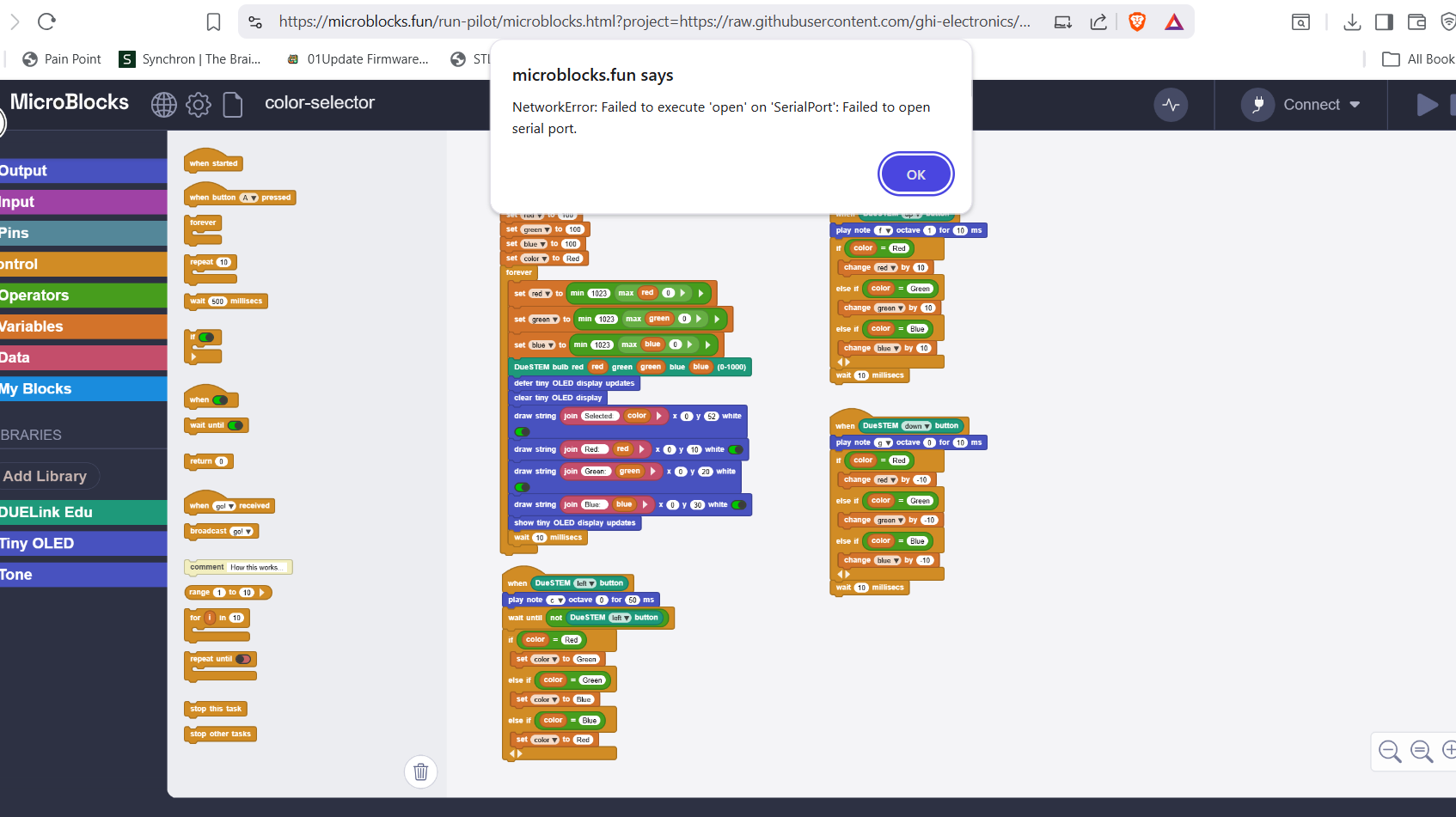 You might want to check your sample projects loading from the duestem duelink.com web page. I have loaded all examples that you give by double clicking on them and then using each example on the hardware and then saving the example as a file to my Lenovo Windows laptop hard drive. Of course this environment is “pilot” for MicroBlocks. Going from one loaded example on the DueSTEM board to attempt to load the next example I get the below message. Repeated attempts to load the same new example give the same error message. The workaround for me is to unplug USB from one port and plug the cable into a different port on the laptop. This solves the issue. Thank you.